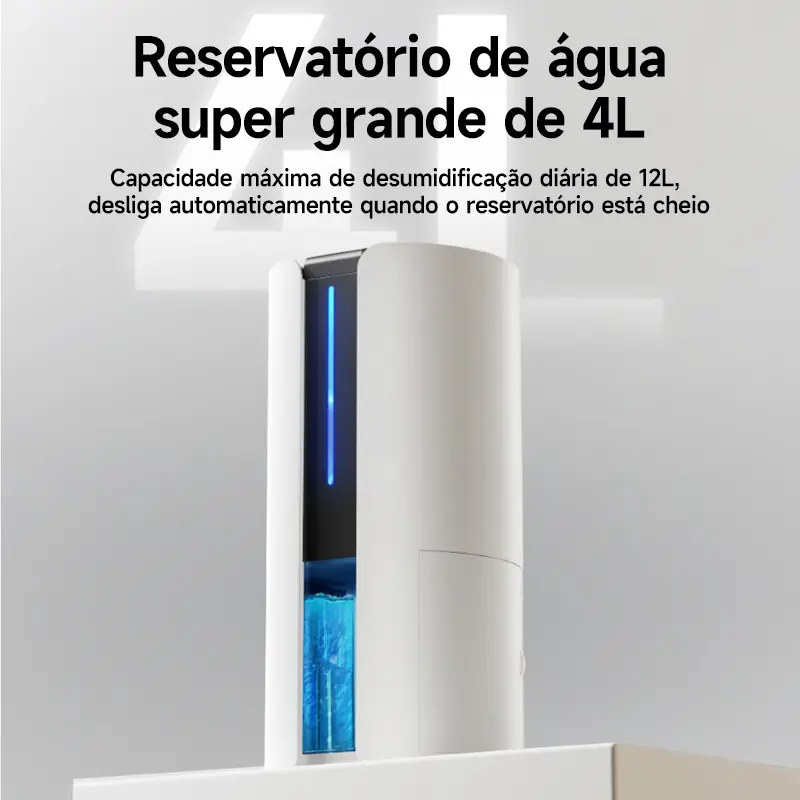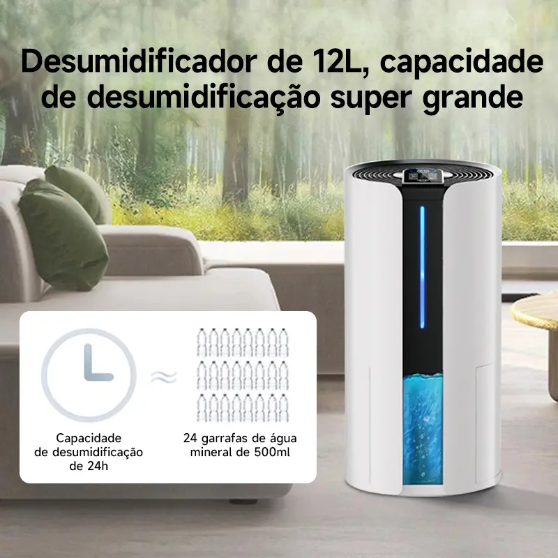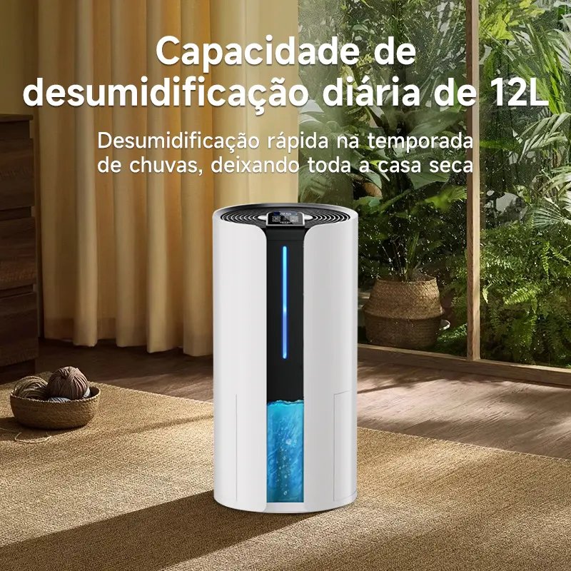 Desumidificador de alta performance com capacidade de extração de até 12 L/dia, ideal para ambientes de até 150 m². Possui reservatório de 4 L, operação silenciosa, função de secagem de roupas, purificação do ar e drenagem contínua. Solução eficiente para controle de umidade com mais conforto, praticidade e qualidade do ar.